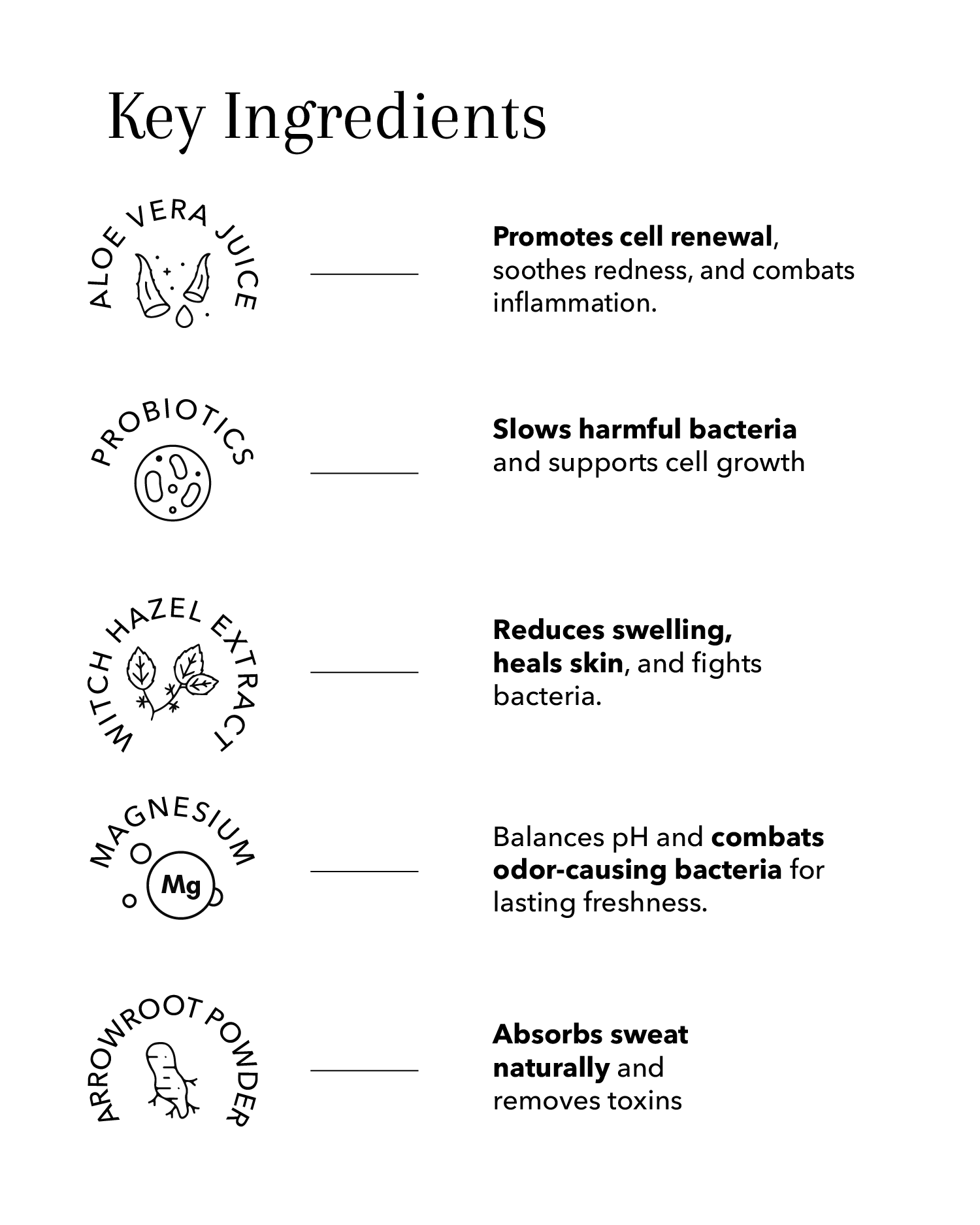 Ingredients: Aloe Vera Leaf Juice, Witch Hazel Extract, Magnesium Hydroxide, Arrowroot Powder, Lactobacillus Ferment, Glycerine, Xanthan Gum, Glyceryl Caprylate, Sodium Caproyl/Lauroyl Lactylate/Triethyl Citrate/Salvia Officinalis (Sage) Oil, Citric Acid, Chamomile Essential Oil.