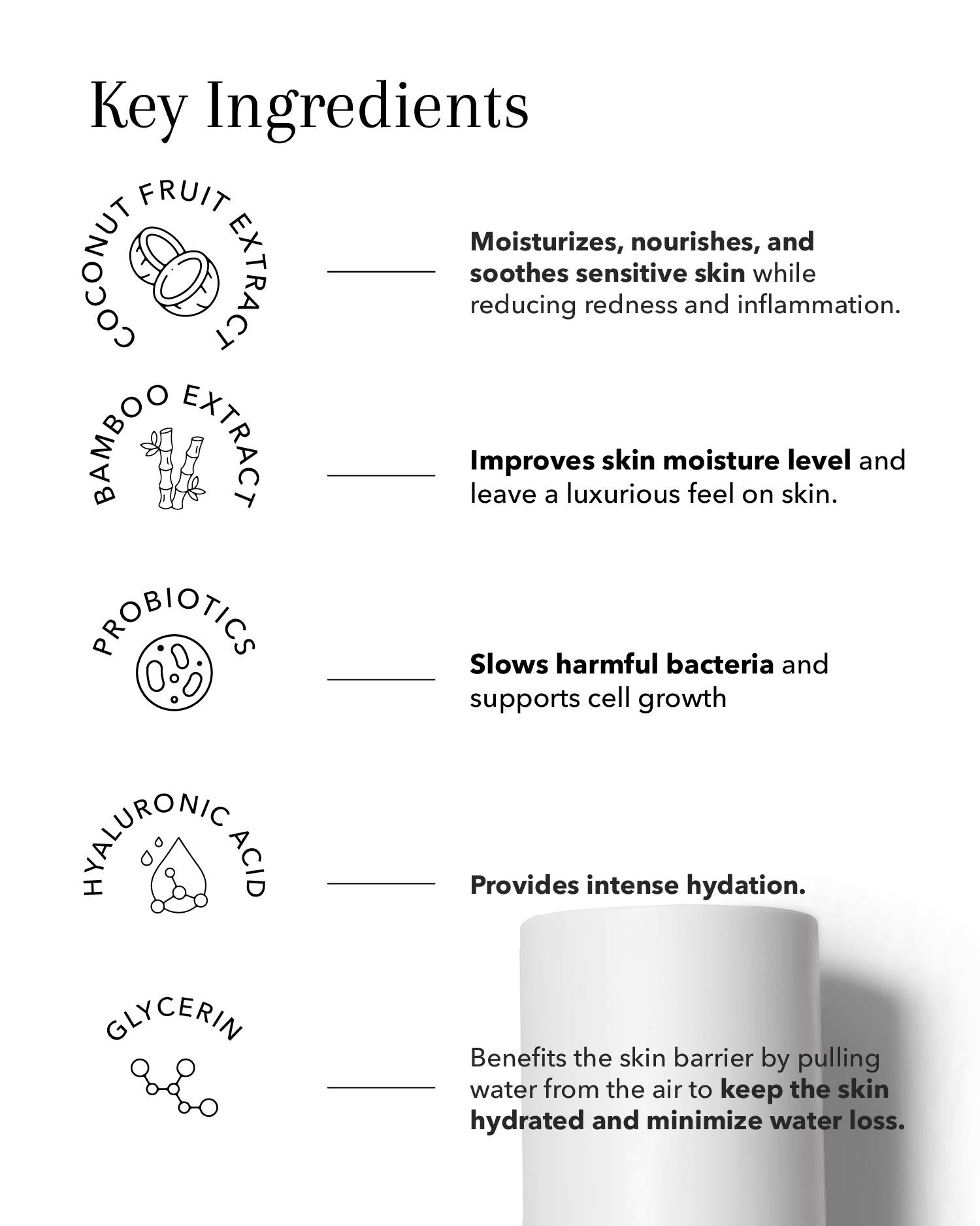 Aqua, Cocos Nucifera (Coconut) Water, Lactobacillus/Arundinaria Gigantea Ferment Filtrate, Glycerin, Sodium Hyaluronate, Sodium Lauryl Sarcosinate, Hydroxyacetophenone, Glyceryl Laurate, Pentylene Glycol, Natural Flavours.