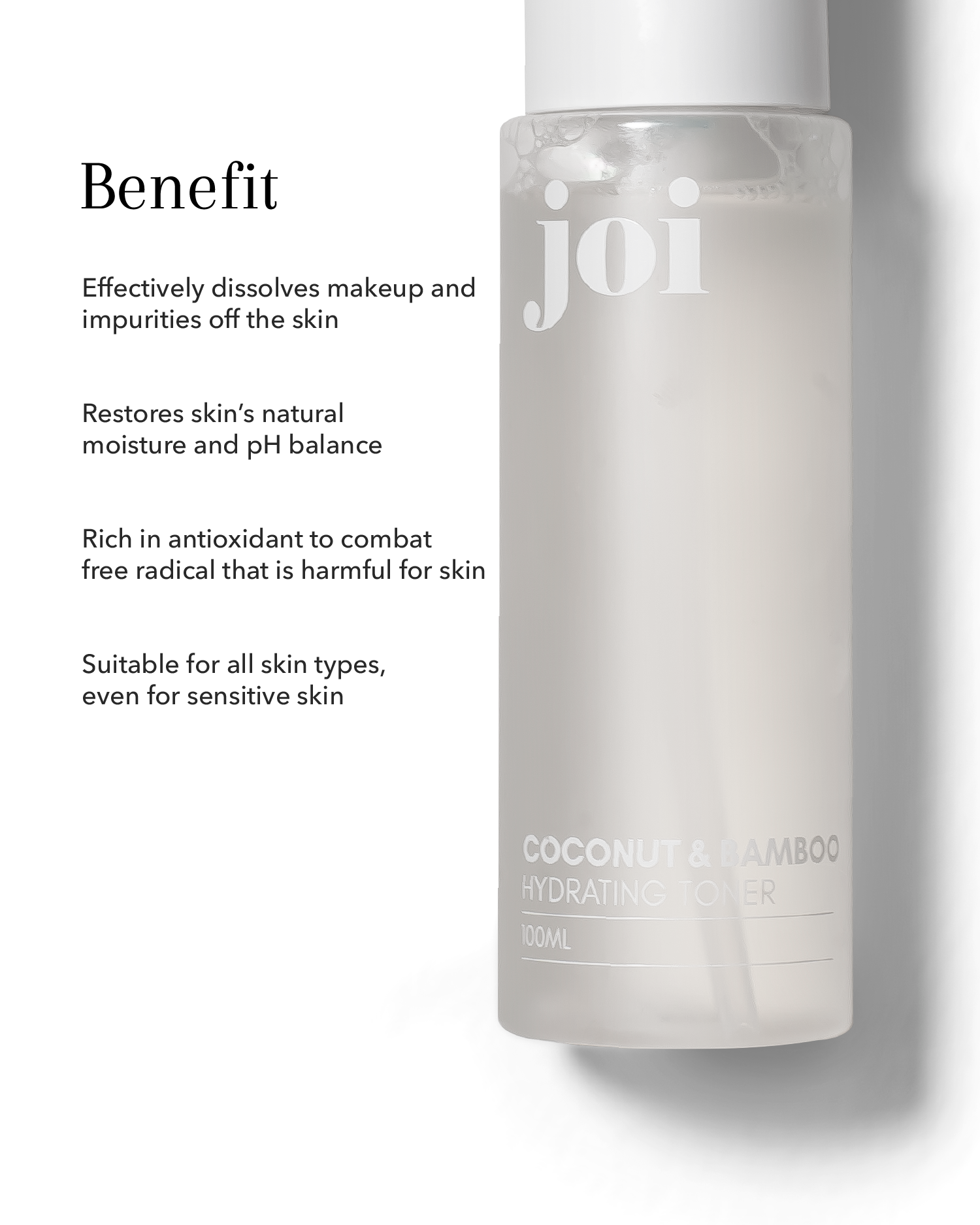 Perfect for removing post-cleanse residue and lifts remaining traces of makeup. This hydrating toner keeps skin dewy and fresh throughout the day. Filled with coconut water and bamboo extract, this high nutrient formula replenishes the moisture in the skin leaving it smooth, soft, and hydrated.