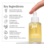 Simmondsia Chinensis Seed Oil (Jojoba Oil), Macadamia Integrifolia Seed Oil, Persea Gratissima (Avocado) Oil, Argania Spinosa Kernel Oil, Squalane, Helichrysum Italicum Flower Oil (Helichrysum Oil), Vitamin E, Bisabolol.