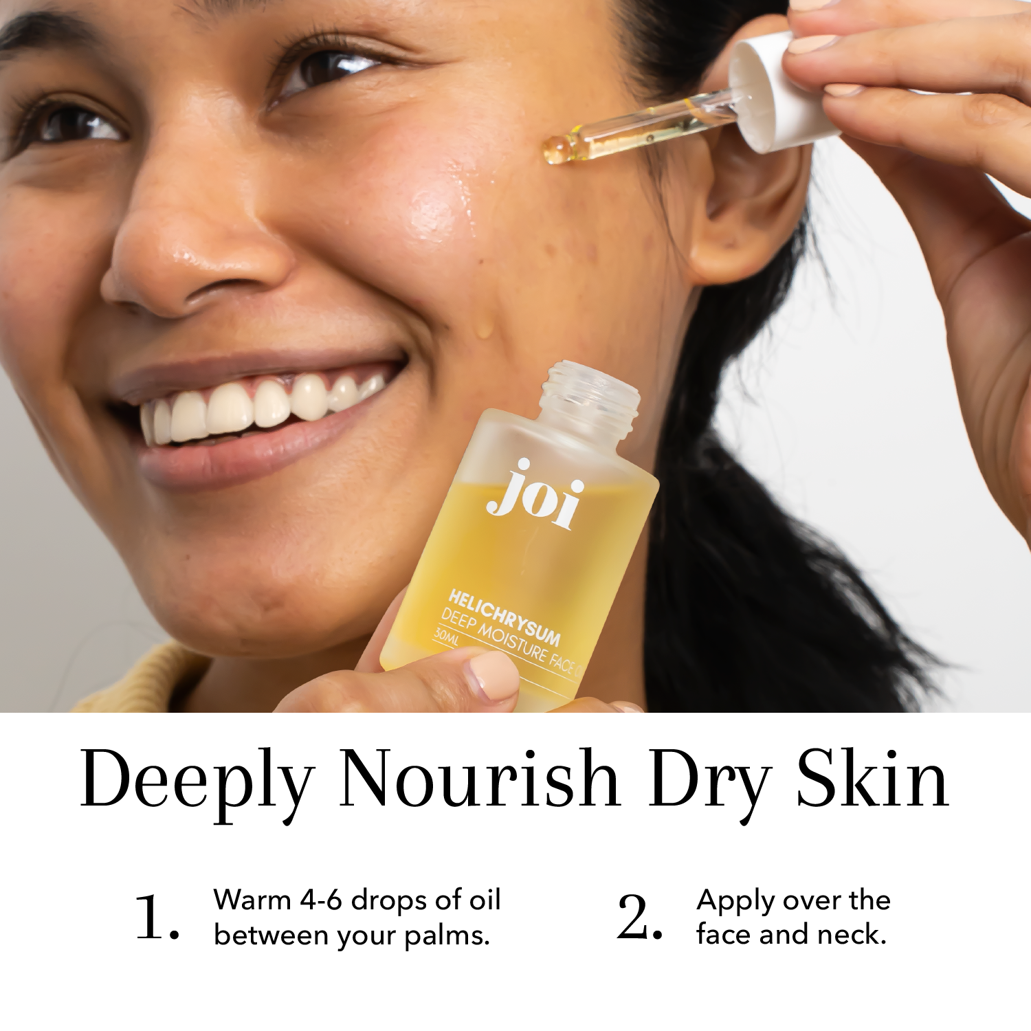 Warm 4-6 drops of oil between your palms and apply over the face and neck.